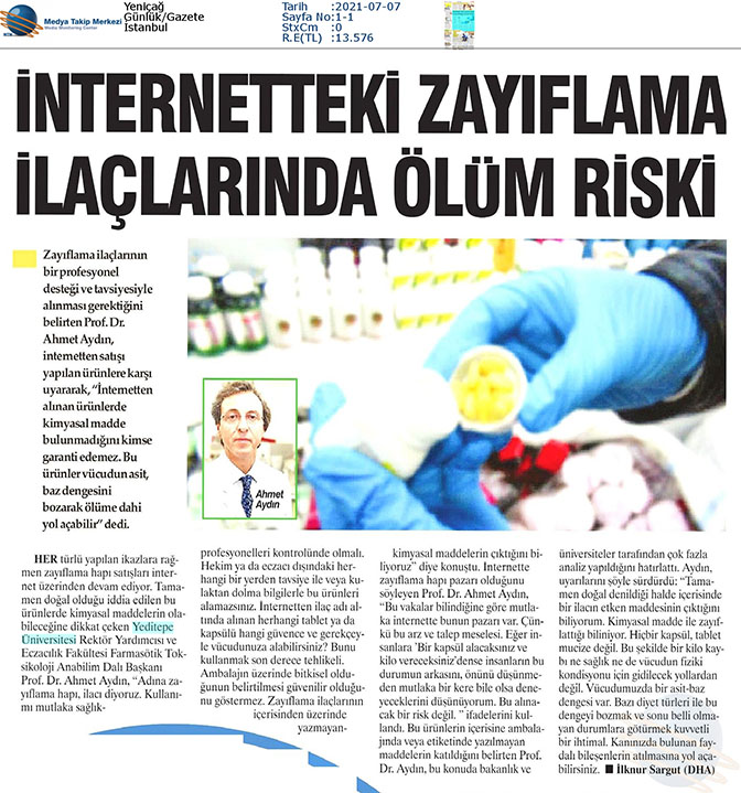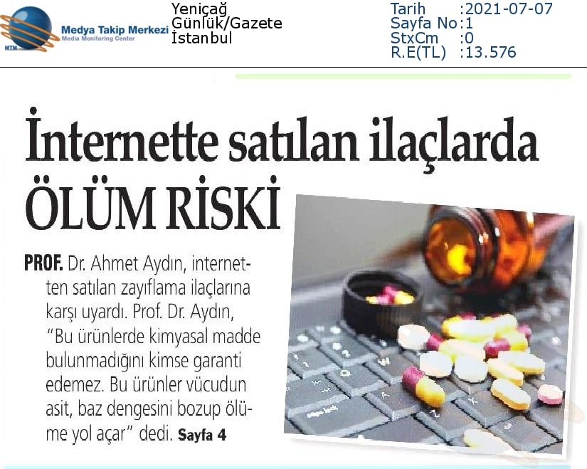 Zayıflama ilaçlarının bir profesyonel desteği ve tavsiyesiyle alınması gerektiğini belirten Prof. Dr. Ahmet Aydın, internetten satışı yapılan ürünlere karşı uyardı. Prof. Dr. Aydın, “İnternetten alınan ürünlerde kimyasal madde bulunmadığını kimse garanti edemez. Bu ürünler vücudun asit, baz dengesini bozarak ölüme dahi yol açabilir” dedi.