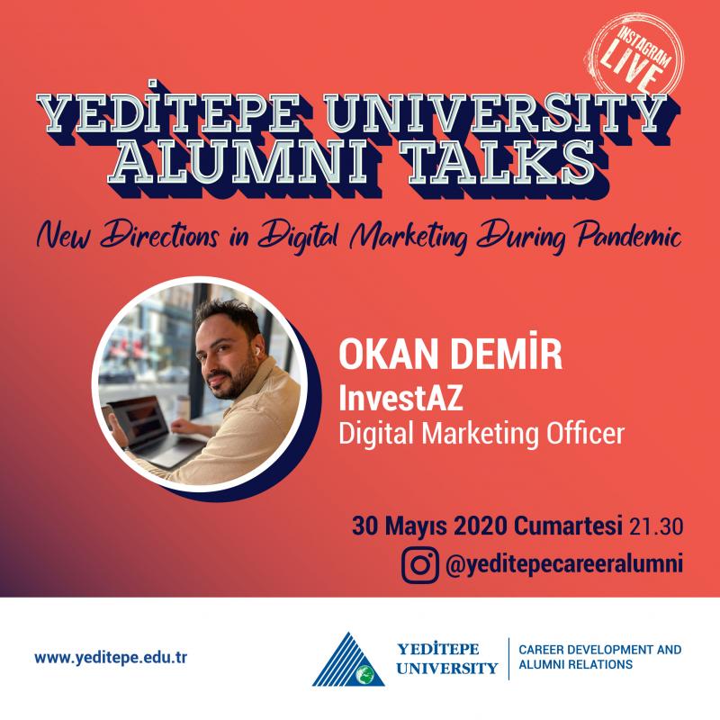See you on Instagram live broadcast on Saturday, May 30th, 2020 at 09.30 PM, with all of Yeditepe family who want to accompany us, in our alumni talk on the direction of digital marketing during the pandemic process!