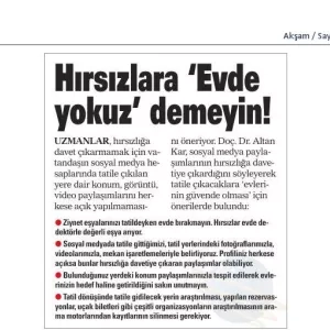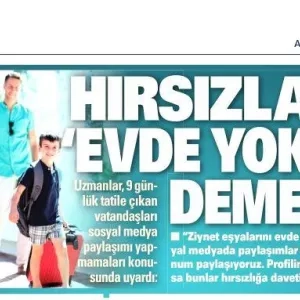 Assoc. Prof. Dr. Altan Kar, Head of the Department of E-commerce and Management at Yeditepe University's Faculty of Economics and Administrative Sciences, has warned that social media posts on vacation could invite burglaries.