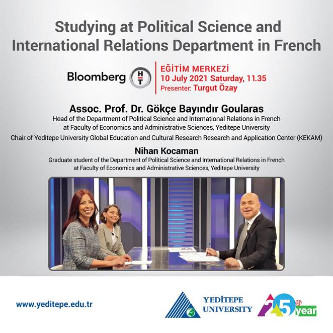 Head of the Department of Political Science and International Relations in French at Faculty of Economics and Administrative Sciences of Yeditepe University as well as Chair of Yeditepe University Global Education and Cultural Research Research and Application Center (KEKAM), Assoc. Prof. Dr Gökçe Bayındır Goularas and Nihan Kocaman, graduate student of the Department of Political Science and International Relations in French at Faculty of Economics and Administrative Sciences of Yeditepe University, are hosted by Turgut Özay on 10 July, Saturday, at 11.35. Goularas ad Kocaman will talk about the advantages of studying political science and international relations in French.