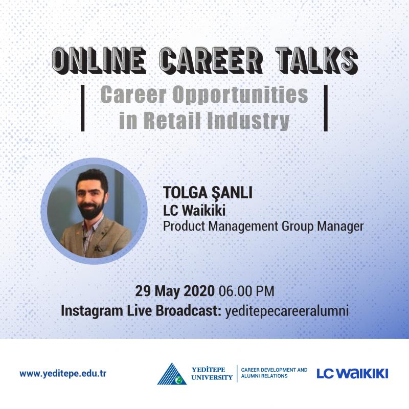 We are waiting for you to join "Online Career Talks", a special event for Yeditepe family, which will be held on Friday, May 29th 2020 at 6:00 PM with LC Waikiki Product Management Group Manager Tolga Şanlı.