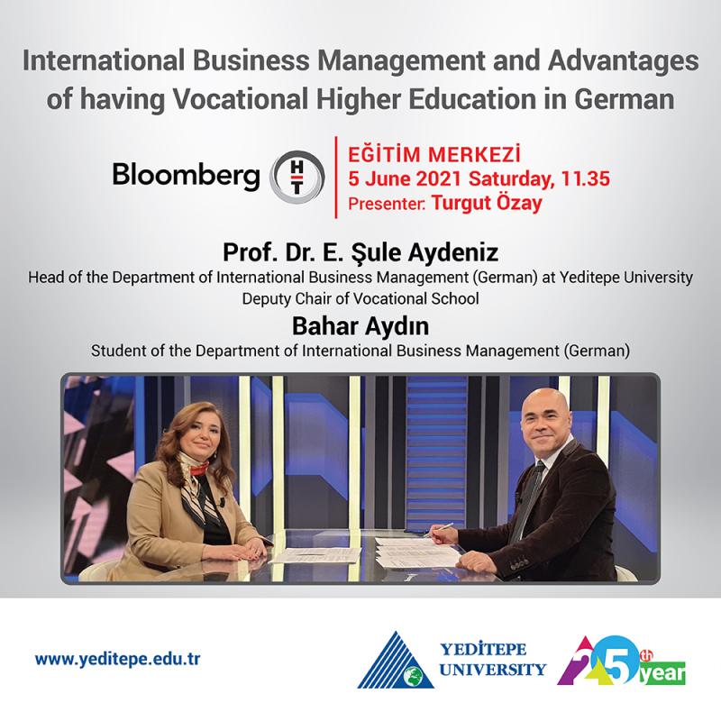 Head of the Department of International Business Management (German) at Yeditepe University and Deputy Chair of Vocational School, Prof. Dr. E. Şule Aydeniz and Bahar Aydın, Student of the Department of International Business Management (German) are hosted by Turgut Özay on Eğitim Merkezi on 5 June, Saturday, at 11.35. Prof. Dr. Aydeniz will talk about the education at their department and the Erasmus, international internships and vocational application opportunities provided by the department, while Bahar Aydın will be talking about her experiences of these opportunities.