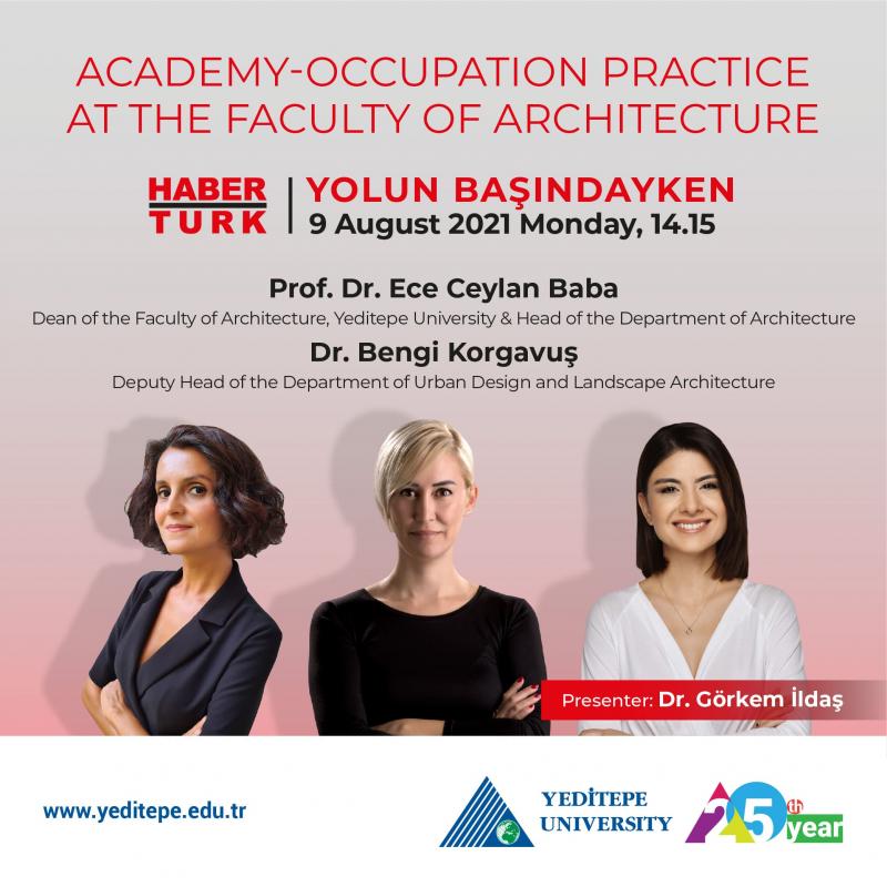 Dean of the Faculty of Architecture at Yeditepe University and the Head of the Department of Architecture, Prof. Dr. Ece Ceylan Baba, and Deputy Head of the Department of Urban Design and Landscape Architecture, Dr. Bengi Korgavuş will be hosted by Dr. Görkem İldaş on Habertürk TV on 9 August 2021, Monday, at 14.15. Ece Ceylan Baba and Bengi Korgavuş will talk about the studies, projects, cooperations, job opportunities and sustainability at the intersection of academy – occupation at the Faculty of Architecture.