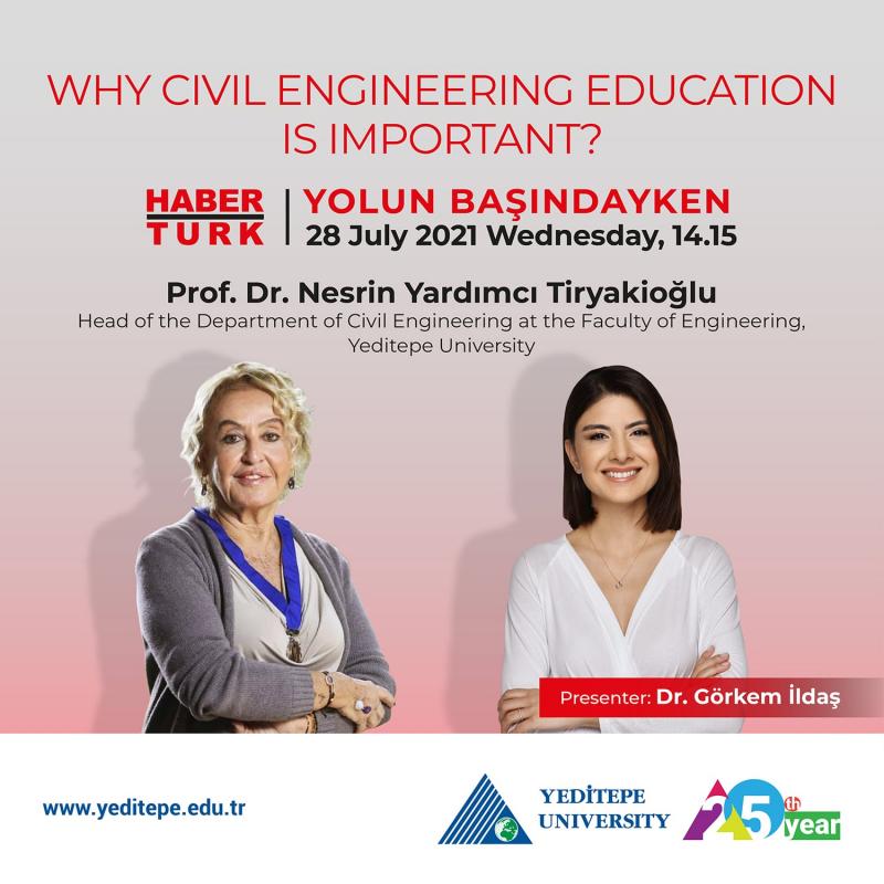 Head of the Department of Civil Engineering at the Faculty of Engineering at Yeditepe University, Prof. Dr. Nesrin Yardımcı Tiryakioğlu will be hosted on Yolun Başındayken program on Habertürk TV by Dr. Görkem İldaş on 28 July, Wednesday, at 14.15. Tiryakioğlu will provide information about the importance of civil engineering education today.