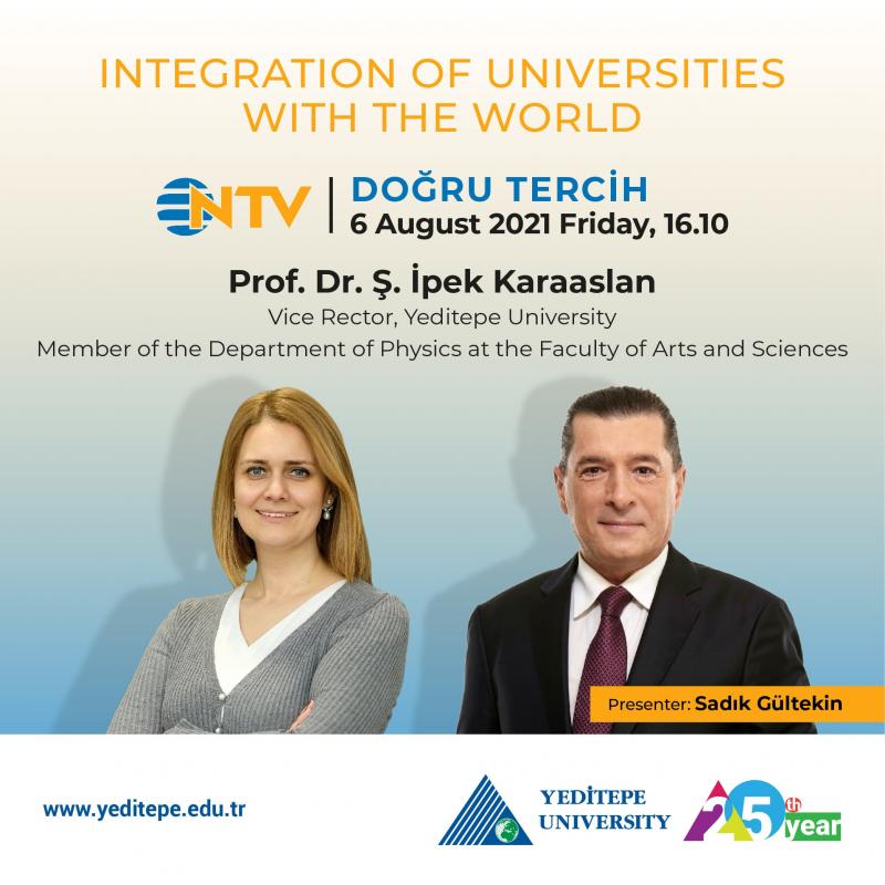 Vice Rector of Yeditepe University and member of the Department of Physics at the Faculty of Arts and Sciences, Prof. Dr. Ş. İpek Karaaslan will be hosted by Sadık Gültekin on NTV’s Doğru Tercih program on 6 August 2021, Friday, at 16.10. Talking about the importance of global integration of universities, Prof. Dr. Karaaslan will also provide information about the efforts in this regard at Yeditepe University.
