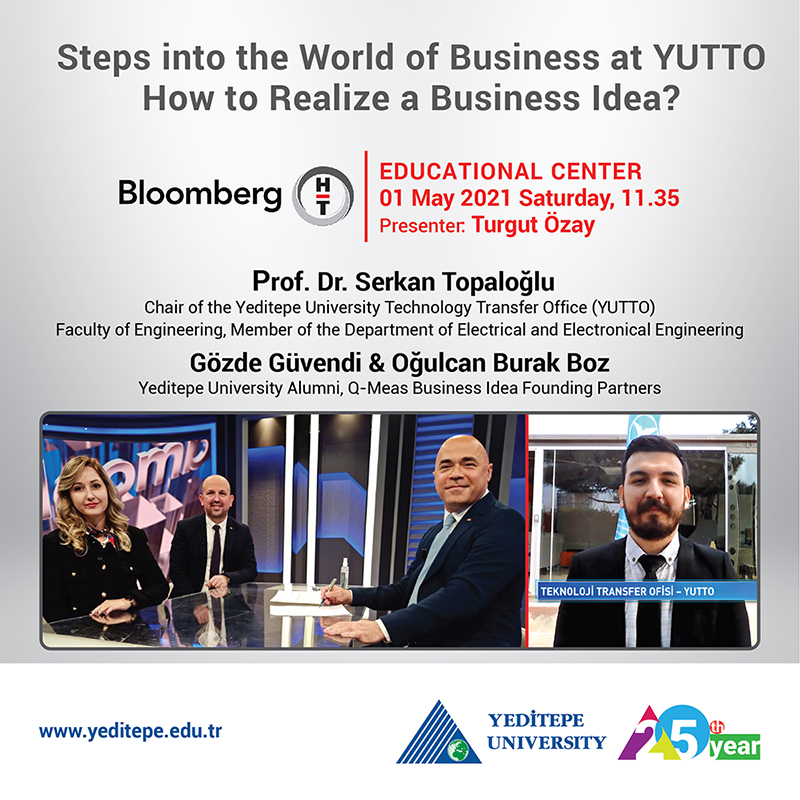 Chair of the Yeditepe University Technology Transfer Office (YUTTO) and Member of the Department of Electrical and Electronical Engineering at Yeditepe University’s Faculty of Engineering, Prof. Dr. Serkan Topaloğlu, as well as our Alumni and Q-Meas Business Idea Founding Partners Gözde Güvendi and Oğulcan Burak Boz are hosted on Bloomberg HT’s Educational Center program on 01 May 2021, Saturday, at 11.35. On the program, Prof. Dr. Serkan Topaloğlu will provide insights into the activities at YUTTO, while Gözde Güvendi and Oğulcan Burak Boz will talk about their journey of entrepreneurship, as well as their business ideas focused on technology and innovation.