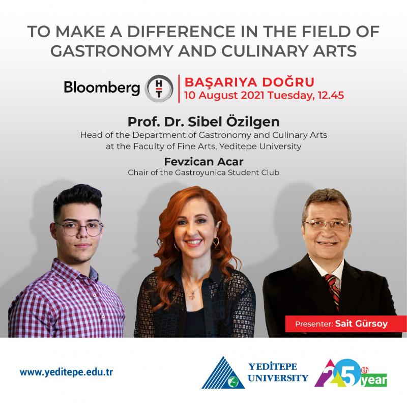 Prof. Dr. Sibel Özilgen, Head of the Department of Gastronomy and Culinary Arts at the Faculty of Fine Arts at Yeditepe University, and Chair of the Gastroyunica Student Club, Fevzican Acar, will be hosted on Bloomberg HT’s Başarıya Doğru program on 10 August 2021, Tuesday, at 12.45, by Sait Gürsoy. While Prof. Dr. Sibel Özilgen will provide information regarding the Department of Gastronomy and Culinary Arts at Yeditepe University and its features making a difference, our Student Fevzican Acar will be talking about the projects they participate at the department.