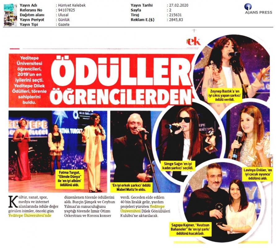 Yeditepe Üniversitesi öğrencilerinin, 2019 yılının en iyilerini, oylarıyla belirlediği Yeditepe Dilek Ödülleri sahiplerini buldu. Kültür, sanat, spor, medya ve internet alanlarında ödüle değer görülen isimler, Yeditepe Üniversitesi’nde düzenlenen törenle ödüllerini aldı.