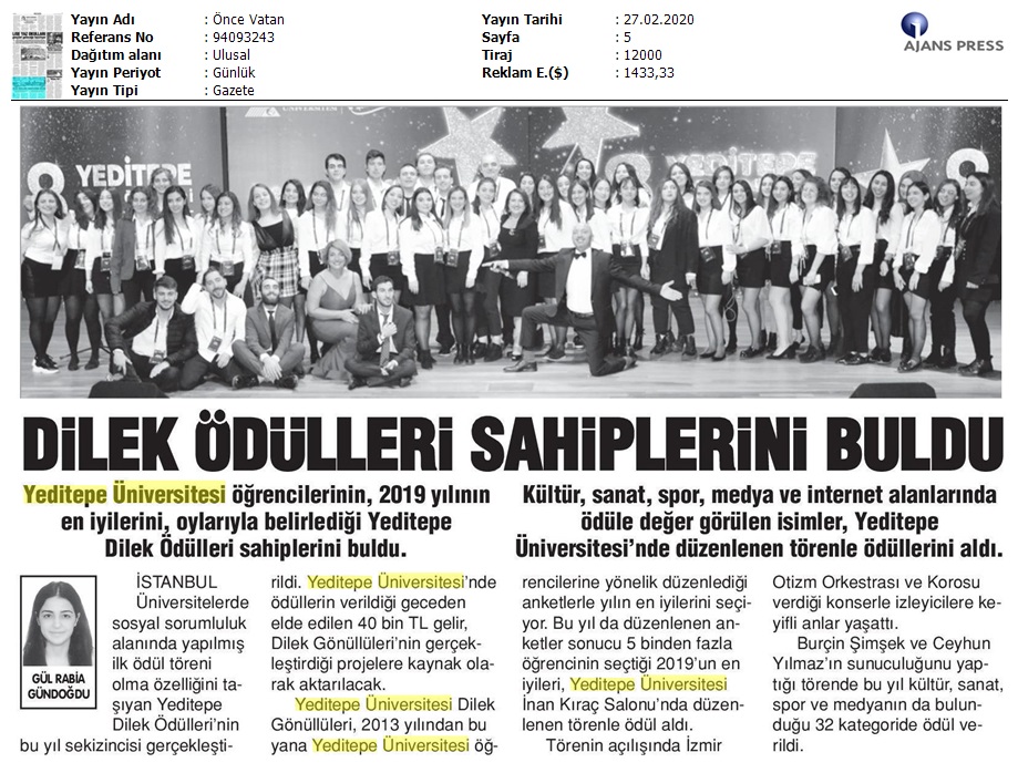 Üniversitelerde sosyal sorumluluk alanında yapılmış ilk ödül töreni olma özelliğini taşıyan Yeditepe Dilek Ödülleri’nin bu yıl sekizincisi gerçekleştirildi. Yeditepe Üniversitesi’nde ödüllerin verildiği geceden elde edilen 40 bin TL gelir, Dilek Gönüllüleri’nin gerçekleştirdiği projelere kaynak olarak aktarılacak.