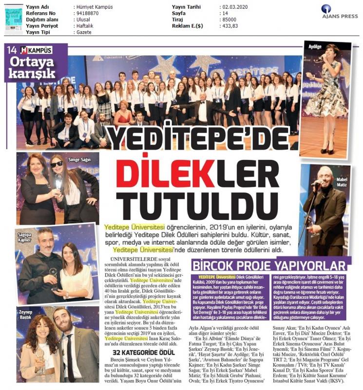 Yeditepe Üniversitesi Dilek Gönüllüleri, 2013 yılından bu yana Yeditepe Üniversitesi öğrencilerine yönelik düzenlediği anketlerle yılın en iyilerini seçiyor. Bu yıl da düzenlenen anketler sonucu 5 binden fazla öğrencinin seçtiği 2019’un en iyileri, Yeditepe Üniversitesi İnan Kıraç Salonu’nda düzenlenen törenle ödül aldı.