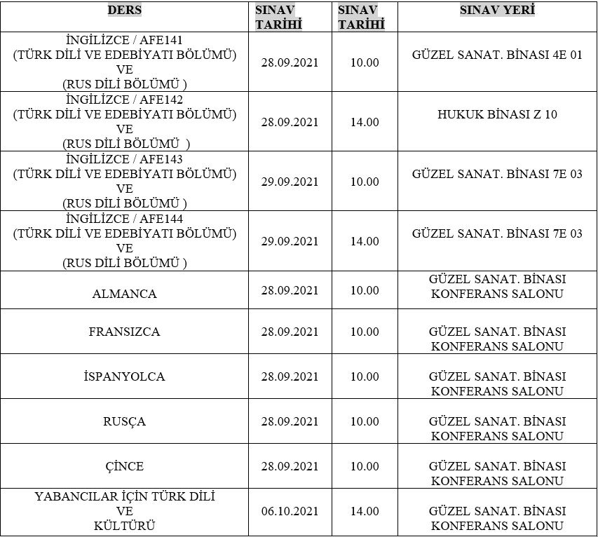2021 Güz Dönemi Yabancı Diller Yüksekokulu Seviye Tespit Sınav Programı