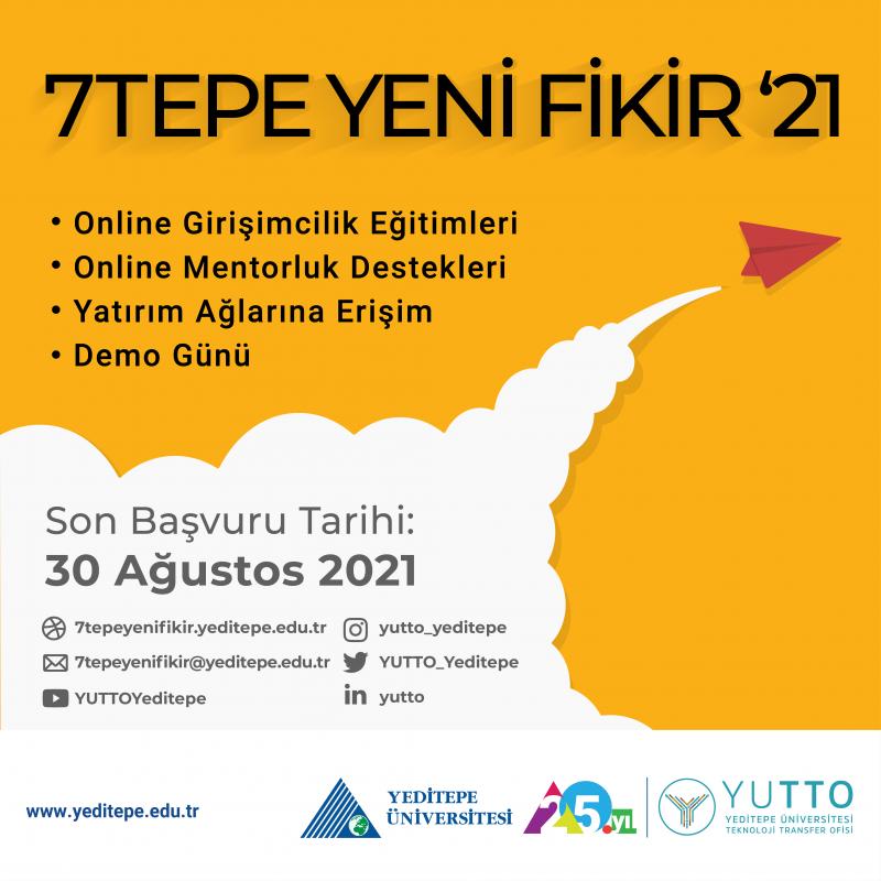 Teknoloji odaklı iş fikirlerinin iş geliştirme eğitimleri, mentorluk, yatırım ağlarına erişim ile destekleneceği 7Tepe Yeni Fikir 2021 Erken Aşama Girişim Hızlandırma Programı çağrısı açıldı. 30 Ağustos 2021 tarihine kadar başvuruları alınacak programa başvuru ve detaylı bilgi için 7tepeyenifikir.yeditepe.edu.tr web sitesini ziyaret edebilir, sorularınız için 7tepeyenifikir@yeditepe.edu.tr e-posta adresinden iletişime geçebilirsiniz.
