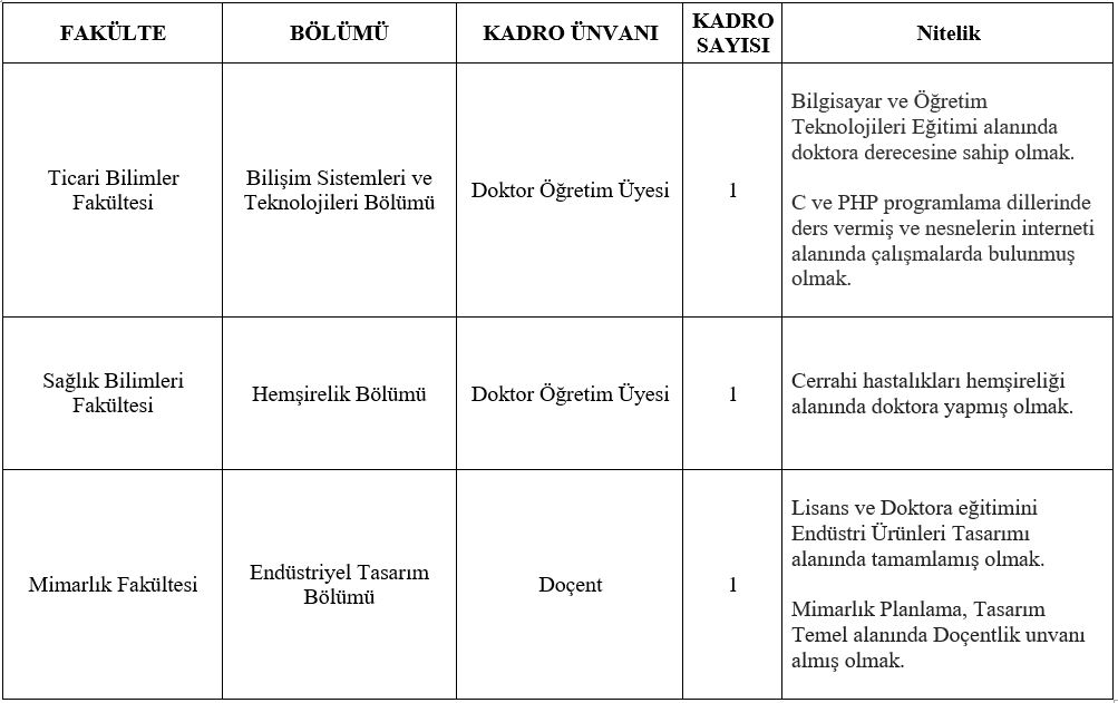 Üniversitemizin aşağıda belirtilen birimlerinde açık bulunan Doçent ve Doktor Öğretim Üyesi kadrolarına 2547 sayılı Yükseköğretim Kanununun 23. ve 24. maddelerine ve Öğretim Üyeliğine Yükseltilme ve Atanma Yönetmeliğinin ilgili maddeleri hükümlerine göre tam zamanlı statüde Öğretim Üyeleri alınacaktır.