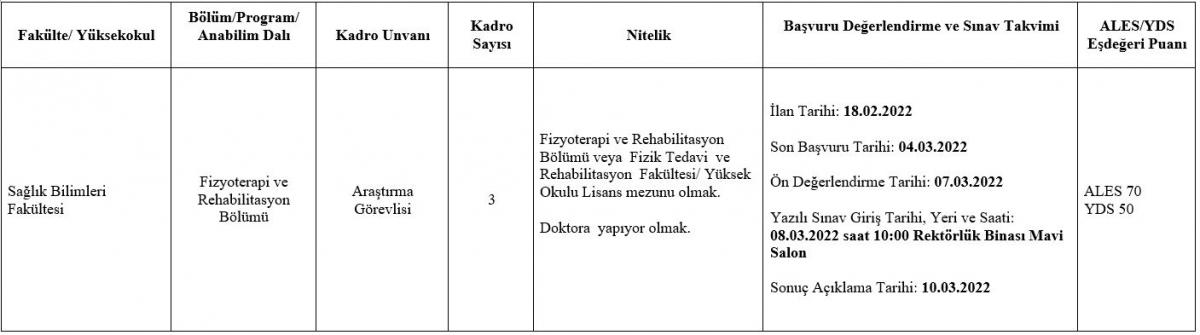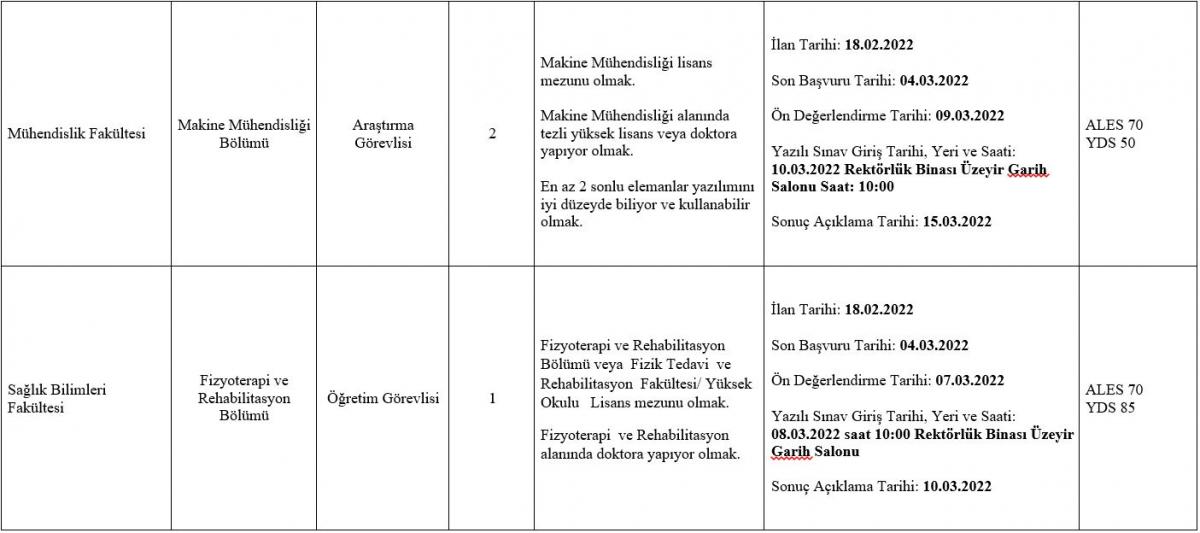 Üniversitemize 2547 sayılı Yükseköğretim Kanunu’nun 31.Maddesi ile 09 Kasım 2018 tarihli, 30590 sayılı Resmi Gazetede yayımlanan ve “Öğretim Üyesi Dışındaki Öğretim Elemanı Kadrolarına Yapılacak Atamalarda Uygulanacak Merkezi Sınav ile Giriş Sınavlarına İlişkin Usul ve Esaslar Hakkında Yönetmelik”in ilgili maddeleri uyarınca unvanı ve nitelikleri belirtilen kadrolara Öğretim Elemanları alınacaktır.