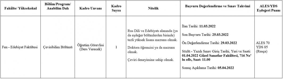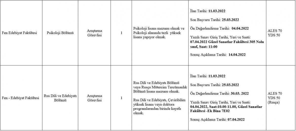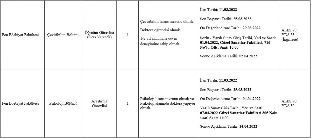 Üniversitemize 2547 sayılı Yükseköğretim Kanunu’nun 31.Maddesi ile 09 Kasım 2018 tarihli, 30590 sayılı Resmi Gazetede yayımlanan ve “Öğretim Üyesi Dışındaki Öğretim Elemanı Kadrolarına Yapılacak Atamalarda Uygulanacak Merkezi Sınav ile Giriş Sınavlarına İlişkin Usul ve Esaslar Hakkında Yönetmelik”in ilgili maddeleri uyarınca unvanı ve nitelikleri belirtilen kadrolara Öğretim Elemanları alınacaktır.