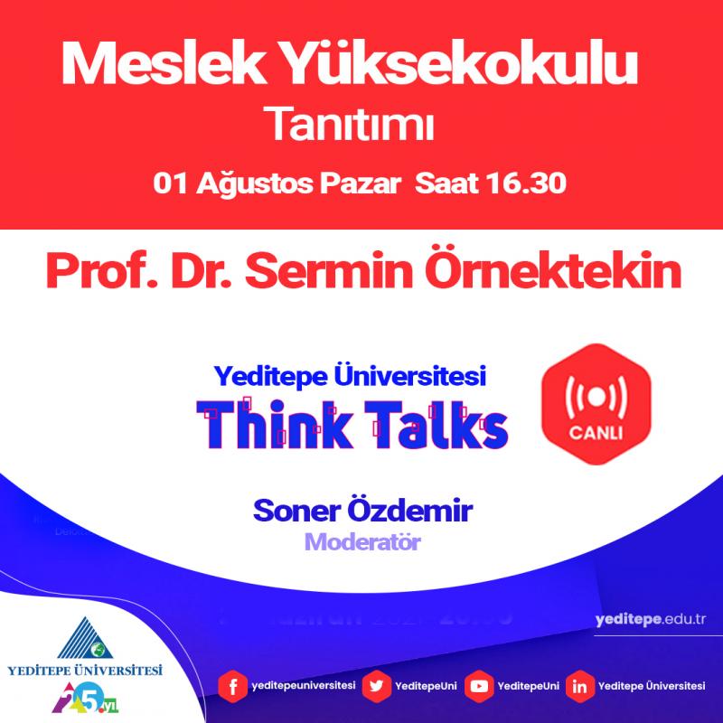 Think Talks Akademi ilk bölümünde Prof. Dr. Sermin Örnektekin Meslek Yüksekokulu ve bölümleri hakkında merak edilen soruları yanıtlıyor. Facebook, Youtube, Linkedin ve Twitter sosyal medya hesaplarımızdan 1 Ağustos pazar günü saat 16:30'da canlı yayınlanacak programımızı sakın kaçırmayın.