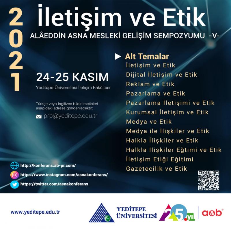 Türkiye Halkla İlişkiler Derneği ve A&B İletişim'in kurucusu Prof. Dr. Alâeddin Asna Mesleki Gelişim Sempozyumu'nun beşincisi "İletişim ve Etik" ana başlığı altında 24-25 Kasım 2021 tarihleri arasında Yeditepe Üniversitesi İletişim Fakültesi'nin ev sahipliğinde düzenlenecektir.