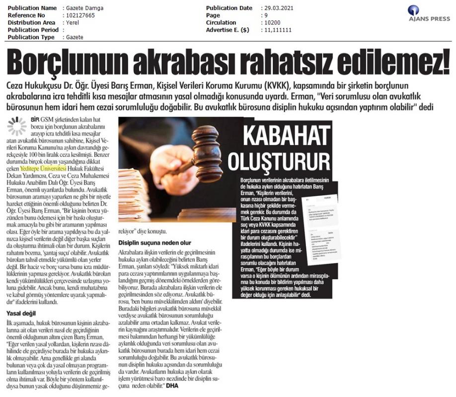 Bir GSM şirketinden kalan hat borcu için borçlunun akrabalarını arayıp icra tehditli kısa mesajlar atan avukatlık bürosunun sahibine, Kişisel Verileri Koruma Kanunu'na aykırı davrandığı gerekçesiyle 100 bin liralık ceza kesildi. Üniversitemiz Hukuk Fakültesi Dekan Yardımcısı, Ceza ve Ceza Muhakemesi Hukuku Anabilim Dalı Öğr. Üyesi Barış Erman, benzer durumda birçok olayın yaşandığına dikkat çekti. Kişisel Verileri Koruma Kurumu (KVKK), kapsamında bir şirketin borçlunun akrabalarına icra tehditli kısa mesajlar atmasının yasal olmadığı konusunda uyaran Erman, "Veri sorumlusu olan avukatlık bürosunun hem idari hem cezai sorumluluğu doğabilir. Bu avukatlık bürosuna disiplin hukuku açısından yaptırım olabilir" dedi.