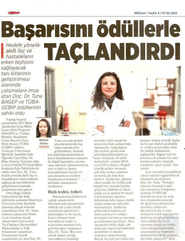 Yaptığı başarılı çalışmalarla 2021 Bilim Akademisi Genç Bilim İnsanı Ödül Programı (BAGEP) ve Türkiye Bilimler Akademisi Üstün Başarılı Genç Bilim İnsanı (TÜBA-GEBİP) ödülleri, Yeditepe Üniversitesi Biyofizik Anabilim Dalı Öğretim Üyesi Doç. Dr. Bilge Güvenç Tuna'nın oldu. Loreal UNESCO Ulusal Bilim Kadınları İçin Ödülü'nün de sahibi olan Doç. Dr. Tuna, hedefe yönelik akıllı ilaç ve hastalıkların erken teşhisini sağlayacak tanı kitlerinin geliştirilmesi alanında çalışmalara imza atıyor.