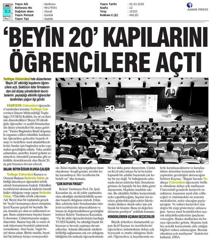 Yeditepe Üniversitesi öğrencileri tarafından kurulan Yeditepe Üniversitesi Sistem Mühendisliği Topluluğu (YUSES) Kulübü, bu yıl on ikicisini düzenledikleri ‘Beyin’20’ etkinliğiyle öğrenciler ve çeşitli firmalardan üst düzey yöneticileri bir araya getiriyor. ‘Yarına Bugünden Başla’ sloganıyla organize edilen etkinlikte katılımcılar, öğrencilere gelecekte başarılı olmayı ve hedeflere nasıl ulaşılabileceklerini, bunlar için bugünden neler yapmaları gerektiğini anlatacak. Vaka analizi çalışmaları, paneller, kişisel gelişim seminerleri, interaktif yarışmalar gibi etkinlikle desteklenecek olan Beyin’20, üç gün boyunca devam edecek.