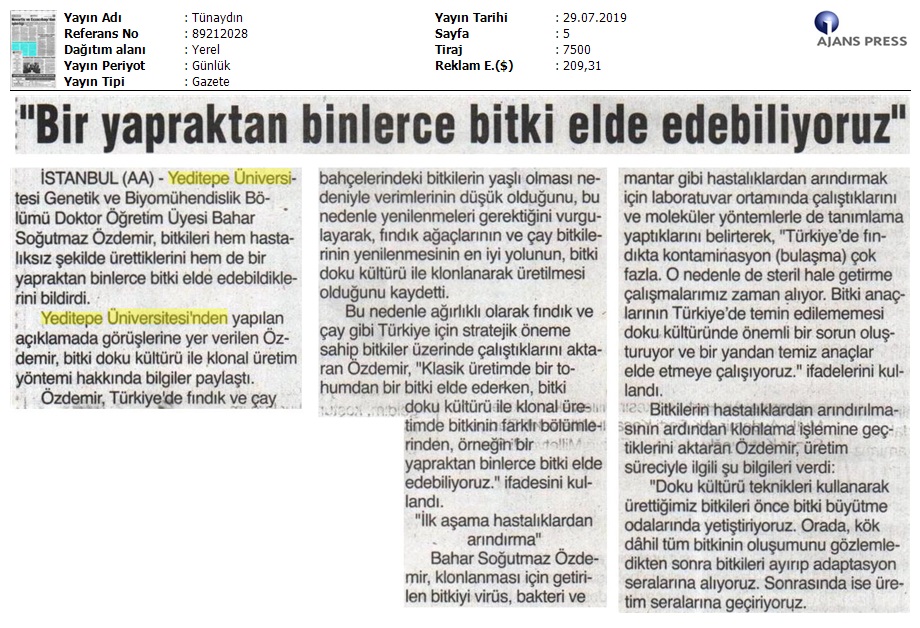 Yeditepe Üniversitesi Genetik ve Biyomühendislik Bölümü Dr. Öğr. Üyesi Bahar Soğutmaz Özdemir, “Bitkileri hem hastalıksız şekilde üretiyoruz hem de bir yapraktan binlerce bitki elde edebiliyoruz” dedi