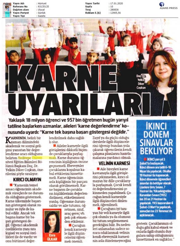 Karnenin, eğitim öğretim sürecinin öğrenciye bilişsel, duyuşsal ve psikomotor özellikler bakımından neyi ne kadar kazandırdığını gösteren önemli bir araç olduğunu anımsatan Doç. Dr. Yelkin Diker Coşkun, “Bu nedenle karne akademik gelişimi desteklemede önemli bir yol gösterici olarak da görülür. Bu anlamda karne öğrencinin hem kendisi hem de ailesi için bir öz değerlendirme yapmasına ve gerekiyorsa öğrencinin onayıyla ders çalışma alışkanlıklarında düzenlemeler yapılmasına yardımcı olabilir” dedi.