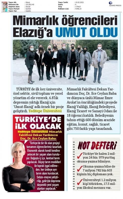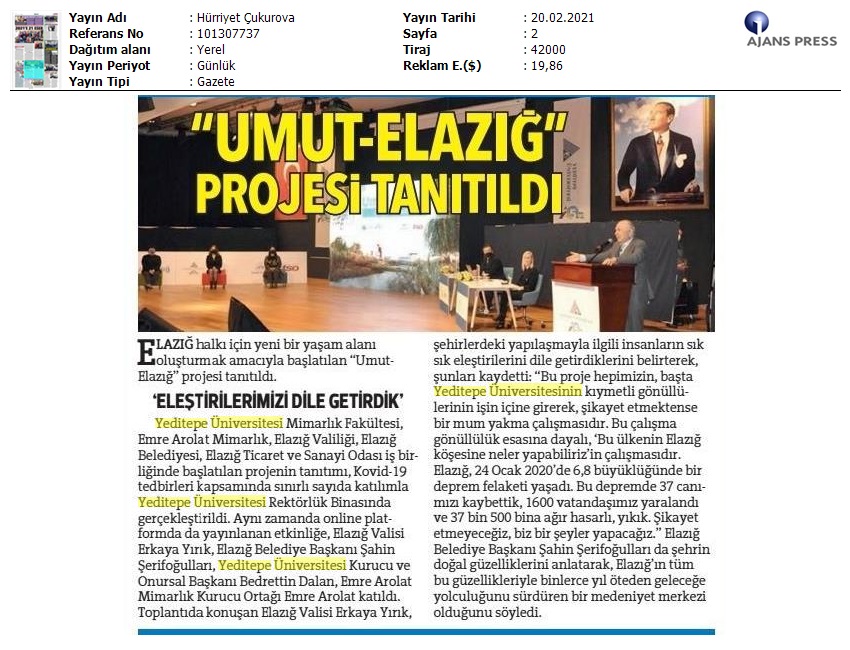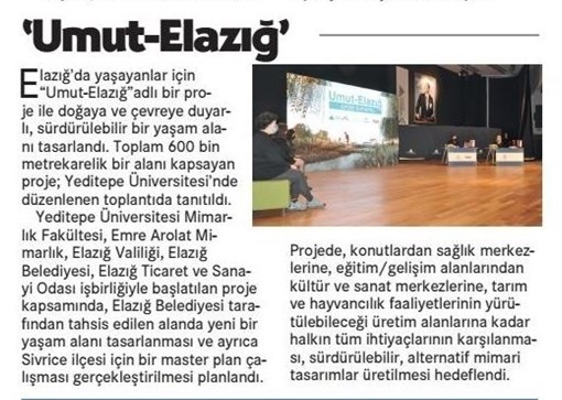 Emre Arolat Mimarlık Kurucu Ortağı Emre Arolat ile Yeditepe Üniversitesi Mimarlık Fakültesi Dekan Yardımcısı Doç. Dr. Ece Ceylan Baba yürütücülüğünde ve bağımsız bir kurul danışmanlığında, Yeditepe Üniversitesi öğrencileri ve aynı üniversiteden yeni mezun mimarların bulunduğu “Umut - Elazığ İleri Tasarım Stüdyosu” oluşturuldu.
