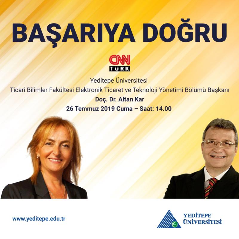 Yeditepe Üniversitesi Ticari Bilimler Fakültesi Elektronik Ticaret ve Teknoloji Yönetimi Bölümü Başkanı Doç. Dr. Altan Kar 26 Temmuz 2019 Cuma günü 14.00’da CNN Türk’te “Başarıya Doğru” programında Sait Gürsoy’un sorularını yanıtlayacak.