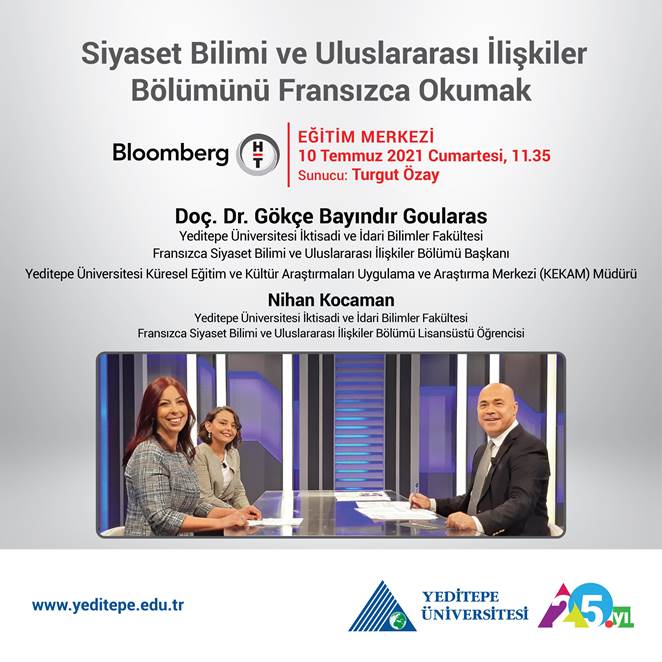 Yeditepe Üniversitesi İktisadi ve İdari Bilimler Fakültesi Fransızca Siyaset Bilimi ve Uluslararası İlişkiler Bölüm Başkanı ve aynı zamanda Yeditepe Üniversitesi Küresel Eğitim ve Kültür Araştırmaları Uygulama ve Araştırma Merkezi (KEKAM) Müdürü Doç. Dr. Gökçe Bayındır Goularas ile İktisadi ve İdari Bilimler Fakültesi Fransızca Siyaset Bilimi ve Uluslararası İlişkiler Bölümü Lisansüstü Öğrencisi Nihan Kocaman, 10 Temmuz Cumartesi günü, saat 11.35’te, Eğitim Merkezi’nde Turgut Özay’ın sorularını yanıtlıyor. Goularas ve Kocaman programda Siyaset Bilimi ve Uluslararası İlişkiler eğitimini Fransızca almanın avantajlarını anlatıyor.