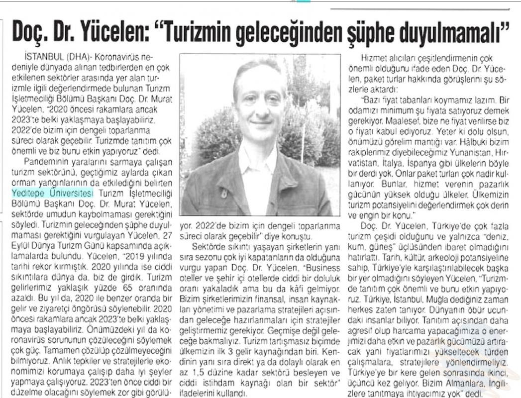 Koronavirüs nedeniyle dünyada alınan tedbirlerden en çok etkilenen sektörler arasında yer alan turizmle ilgili değerlendirmede bulunan Turizm İşletmeciliği Bölümü Başkanı Doç. Dr. Murat Yücelen, “2020 öncesi rakamlara ancak 2023’te belki yaklaşmaya başlayabiliriz, 2022’de bizim için dengeli toparlanma süreci olarak geçebilir. Turizmde tanıtım çok önemli ve biz bunu etkin yapıyoruz” dedi.