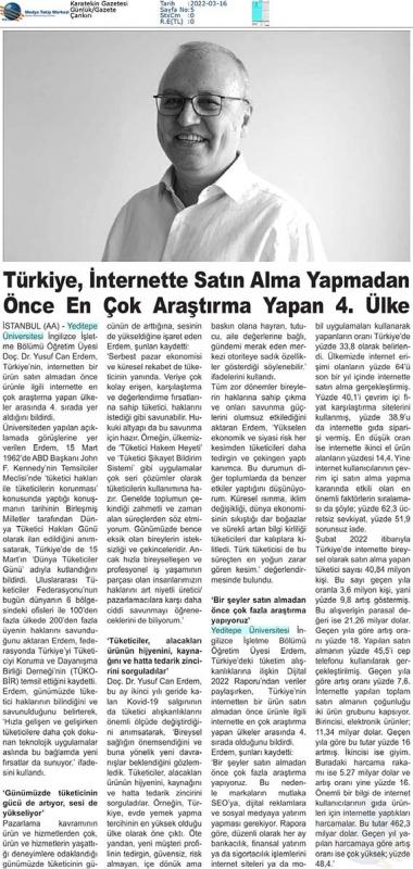 Yeditepe Üniversitesi İngilizce İşletme Bölümü öğretim üyesi Doç. Dr. Yusuf Can Erdem, 15 Mart Dünya Tüketiciler Günü’ne ilişkin bilgi verdi. Doç. Dr. Erdem, 15 Mart 1962’de ABD Başkanı John F. Kennedy’nin Temsilciler Meclisi’nde “Tüketici Hakları ile Tüketicilerin Korunması” konusunda yaptığı konuşmanın tarihinin, Birleşmiş Milletler tarafından Dünya Tüketici Hakları Günü olarak ilan edildiğini anımsatarak, ülkemizde de 15 Mart’ın “Dünya Tüketiciler Günü” adıyla kutlandığını belirtti.