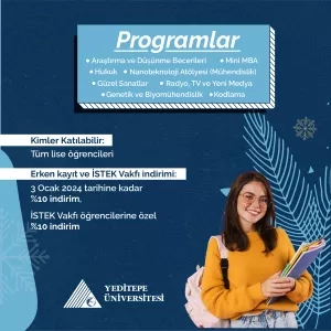 Lise Kış Okulu 2024 programı, 22 – 26 Ocak 2024 tarihleri arasında Yeditepe Üniversitesi'nde gerçekleşecektir. Lise Kış Okulu'nda amacımız lise öğrencilerinin üniversitedeki bölümleri tanımalarını sağlamak, tercih edecekleri bölümlere dair yeteneklerini keşfetmelerine destek olmak ve üniversiteye giriş motivasyonlarını yükseltmektir. Lise Kış Okulu 2024 programında lise öğrencilerine üniversitemizde bulunan 8 ayrı fakülteden ders seçme imkânı sunulmaktadır.