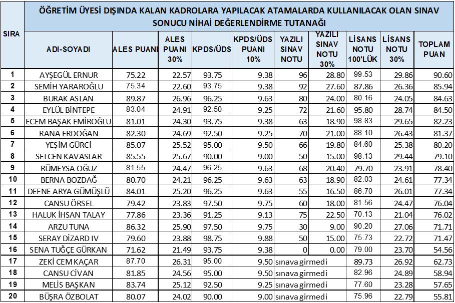 15.12.2021 tarihinde Resmi Gazetede yayınlanan Üniversitemiz Fen-Edebiyat Fakültesi İngiliz Dili ve Edebiyatı Bölümünde ilan edilen 2 adet Araştırma Görevlisi kadrosu için yapılan sınav sonucunda nihai değerlendirme sonuçlarına göre aşağıda isimleri yazılı kişiler açık bulunan Araştırma Görevlisi kadrosuna atanmaya hak kazanmışlardır.