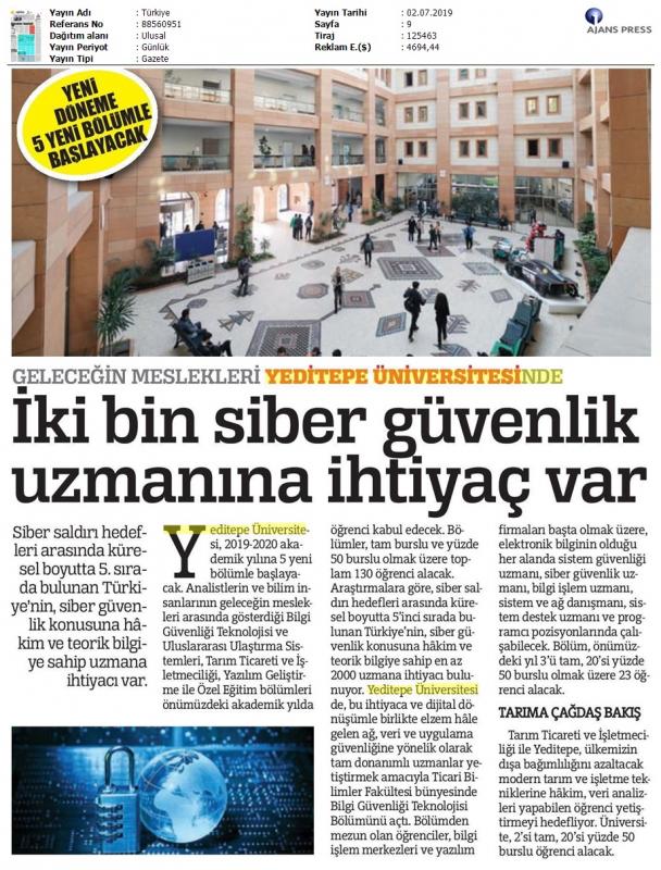 Araştırmalara göre, siber saldırı hedefleri arasında küresel boyutta 5’inci sırada bulunan Türkiye’nin, siber güvenlik konusuna hâkim ve teorik bilgiye sahip en az 2000 uzmana ihtiyacı bulunuyor. Yeditepe Üniversitesi de, bu ihtiyaca ve dijital dönüşümle birlikte elzem hale gelen ağ, veri ve uygulama güvenliğine yönelik olarak tam donanımlı uzmanlar yetiştirmek amacıyla Ticari Bilimler Fakültesi bünyesinde Bilgi Güvenliği Teknolojisi Bölümü’nü açtı. Bölümden mezun olan öğrenciler, bilgi işlem merkezleri ve yazılım firmaları başta olmak üzere, elektronik bilginin olduğu her alanda sistem güvenliği uzmanı, siber güvenlik uzmanı, bilgi işlem uzmanı, sistem ve ağ danışmanı, sistem destek uzmanı ve programcı pozisyonlarında çalışabilecek. Bölüm, önümüzdeki yıl 3’ü tam, 20’si yüzde 50 burslu olmak üzere 23 öğrenci alacak.