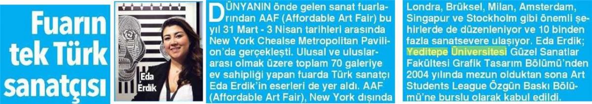 Dünyanın önde gelen sanat fuarlarından AAF (Affordable Art Fair) bu yıl 31 Mart - 3 Nisan tarihleri arasında New York Ciıealse Metropolitan Pavilion'da gerçekleşti. Ulusal ve uluslararası olmak üzere toplam 70 galeriye ev sahipliği yapan fuarda Yeditepe Üniversitesi Güzel Sanatlar Fakültesi Grafik Tasarım Bölümü mezunu Eda Erdik'in eserleri de yer aldı. AAF (Affordable Art Fair), New York dışında Londra, Brüksel, Miian, Amsterdam, Singapur ve Stockholm gibi önemli şehirlerde de düzenleniyor ve 10 binden fazla sanatsevere ulaşıyor. Eda Erdik; Yeditepe Üniversitesi Güzel Sanatlar Fakültesi Grafik Tasarım Bölümü'nden 2004 yılında mezun olduktan sona Art Students League Özgün Baskı Bölümü'ne burslu olarak kabul edildi.
