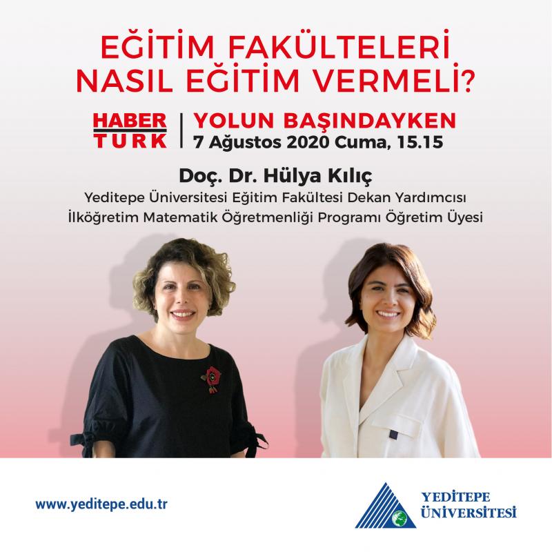 Üniversitemiz Eğitim Fakültesi Dekan Yardımcısı ve İlköğretim Matematik Öğretmenliği Programı öğretim üyesi Doç. Dr. Hülya Kılıç, 7 Ağustos 2020 Cuma günü, saat 15.15’te, Habertürk televizyonunda yayınlanan Yolun Başındayken programında Dr. Görkem İldaş'ın konuğu oluyor. Doç. Dr. Kılıç, geleceğimiz olan gençleri emanet edeceğimiz öğretmenleri yetiştiren eğitim fakültelerinde, nasıl bir eğitim verilmesi gerektiğine dair görüşlerini paylaşıyor.