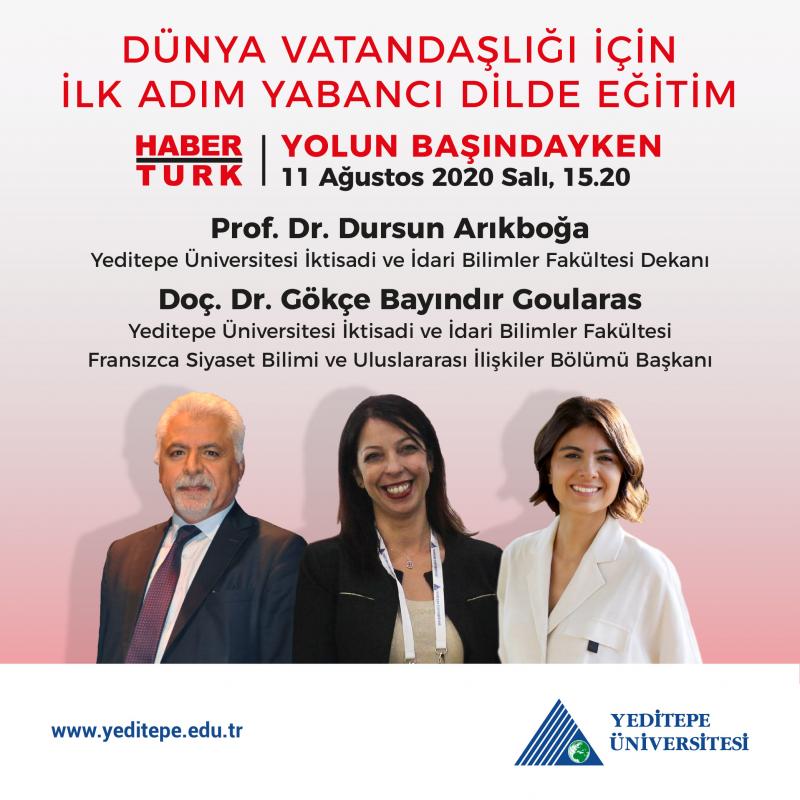 Üniversitemiz İktisadi ve İdari Bilimler Fakültesi Dekanı Prof. Dr. Dursun Arıkboğa ve aynı fakültenin Fransızca Siyaset Bilimi ve Uluslararası İlişkiler Bölümü Başkanı Doç. Dr. Gökçe Bayındır Goularas, 11 Ağustos 2020 Salı günü, saat 15.20’de, Habertürk televizyonunda yayınlanan Yolun Başındayken programında, Dr. Görkem İldaş'ın sorularını yanıtlıyor. Arıkboğa ve Goularas, “dünya vatandaşı” üniversite mezunu olmak için nasıl bir eğitimden geçilmesi gerektiğini anlatıyor.