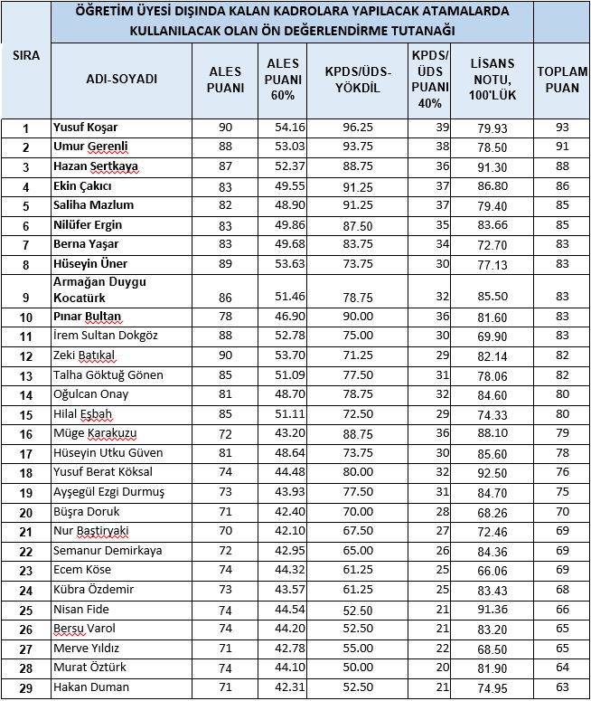 15/11/2021 tarihinde Resmi Gazetede yayınlanan Üniversitemiz İktisadi ve İdari Bilimler Fakültesi Kamu Yönetimi Bölümünde ilan edilen 1 adet Araştırma Görevlisi kadrosuna yapılan başvurular değerlendirilmiş olup, ön değerlendirme sonuçlarına göre aşağıda isimleri yazılı ilk 10 aday 13/12/2021 tarihinde saat: 14.00-16.00 arasında, İİBF/ Hukuk Binası, 319 no’lu salonda yapılacak olan sınava girmeye hak kazanmışlardır.