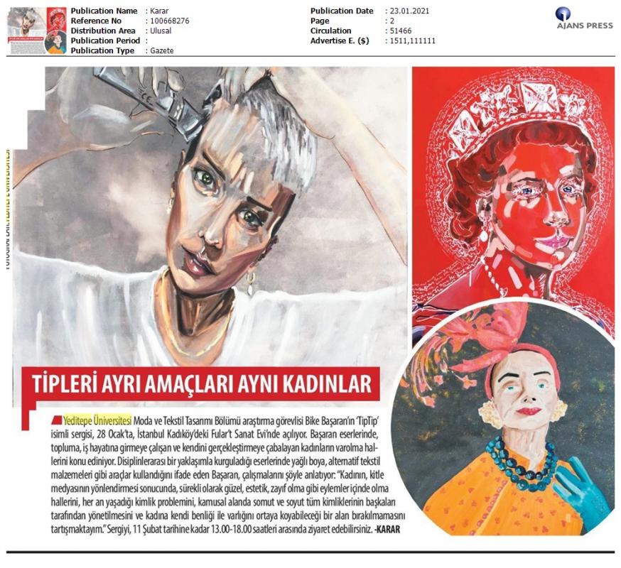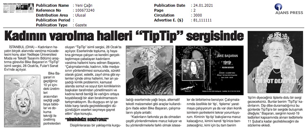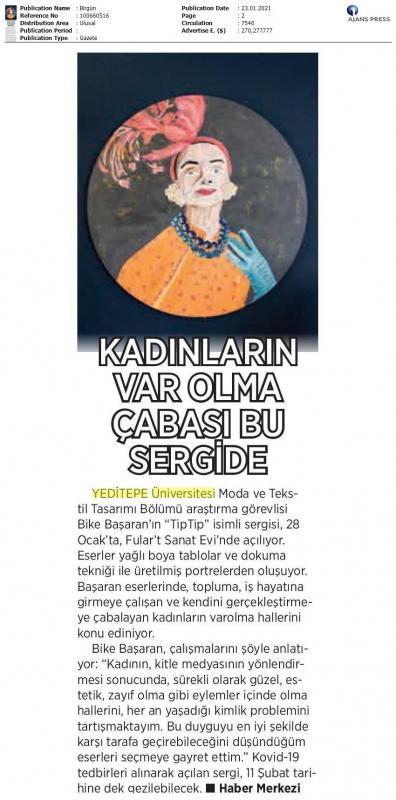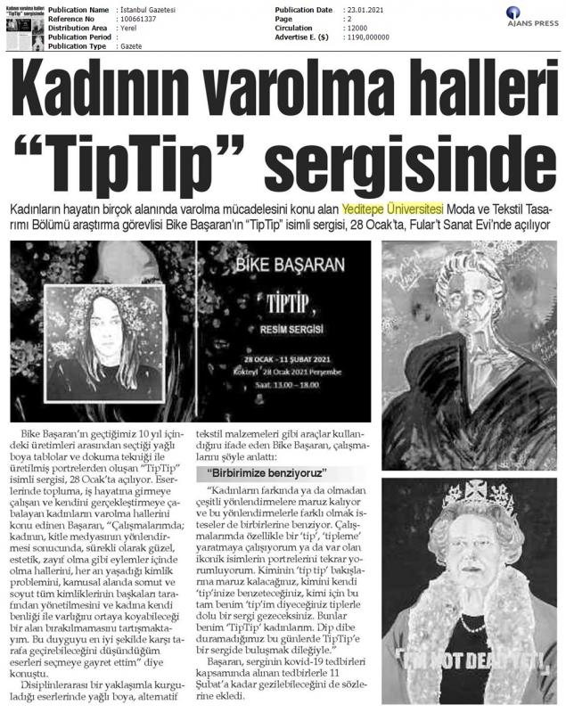 Bike Başaran’ın “TipTip” isimli sergisi, geçtiğimiz 10 yıl içindeki üretimleri arasından seçtiği yağlı boya tablolar ve dokuma tekniği ile üretilmiş portrelerden oluşuyor. Başaran eserlerinde, topluma, iş hayatına girmeye çalışan ve kendini gerçekleştirmeye çabalayan kadınların varolma hallerini konu ediniyor.