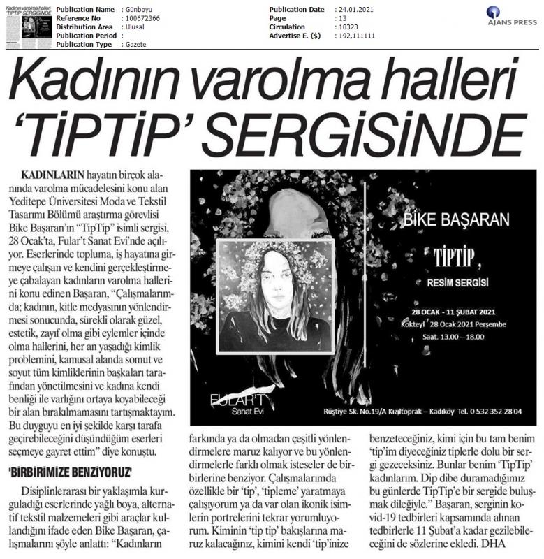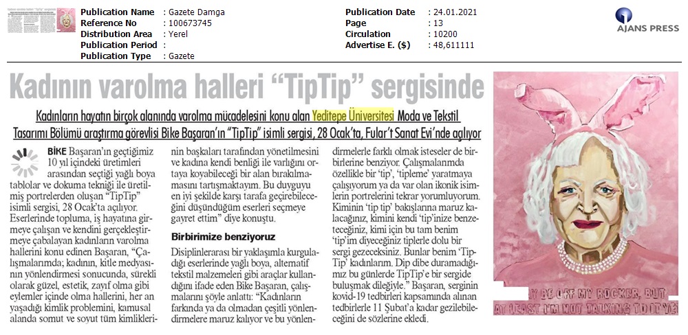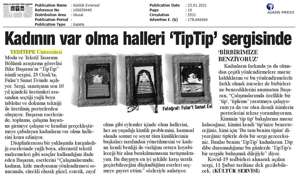 Yeditepe Üniversitesi Moda ve Tekstil Tasarımı Bölümü Araştırma Görevlisi Bike Başaran’ın “TipTip” isimli sergisi, 28 Ocak’ta, Fular’t Sanat Evi’nde açılıyor.