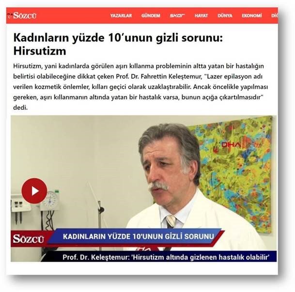 HİRSUTİZM, yani kadınlarda görülen aşırı kıllanma problemi, bir hastalık değil, altta yatan bir hastalığın belirtisi olabiliyor. Yeditepe Üniversitesi Hastaneleri Tıbbi Koordinatörü ve Endokrinoloji uzmanı Prof. Dr. Fahrettin Keleştemur, "Lazer epilasyon gibi kozmetik önlemler, kılları geçici olarak uzaklaştırabilir. Ancak öncelikle yapılması gereken, aşırı kıllanmanın altında yatan bir hastalık varsa, bunun açığa çıkartılmasıdır" dedi.