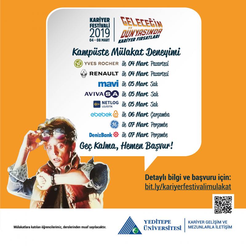 04 - 08 Mart tarihleri arasında gerçekleşecek olan Kariyer Festivali'19 organizasyonu kapsamında, sektöründe lider firmalar sizlerle mülakat gerçekleştirmek için kampüse geliyor. Sen de dönem içerisinde ya da yaz döneminde staj yapmak veya mezuniyetinden önce mülakat deneyimi edinmek istiyorsan, bit.ly/kariyerfestivalimulakat linki üzerinden, 25 Şubat 16.00’ya kadar başvurunu iletebilirsin.