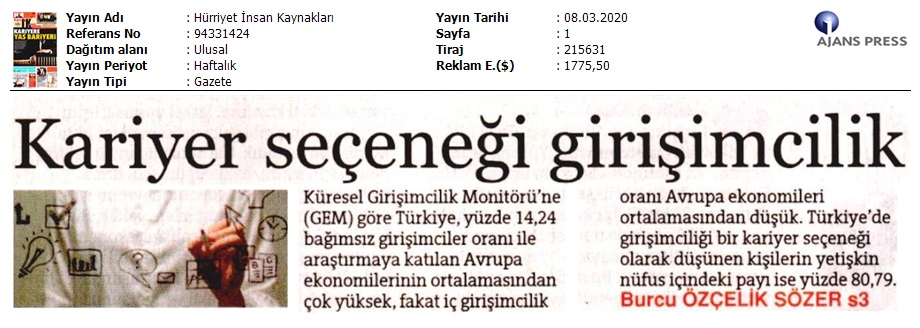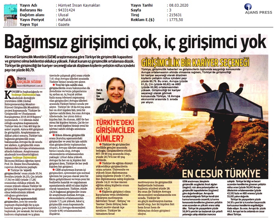 Üniversitemiz Ekonomi Bölümü öğretim üyesi Prof. Dr. Emine Esra Karadeniz, akademik koordinatörlüğünü yaptığı GEM araştırmasını Hürriyet İK’ya anlattı.