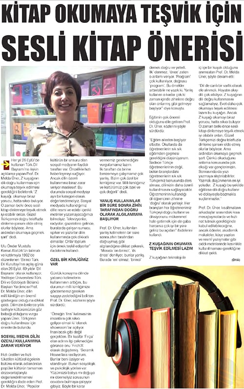 Her yıl 26 Eylül’de kutlanan Türk Dil Bayramı’na ilişkin açıklama yapan Prof. Dr. Melda Üner, Z kuşağının dili doğru kullanması için okumaya teşvik edilmesi gerektiğini belirterek “Z kuşağı, okumayı biraz yorucu, hatta sıkıcı buluyor. O zaman belki önce sesli kitap dinlemeye teşvik etmek iyi olabilir onları. Güzel Türkçemizi doğru telaffuzla dinleme şansını elde etmiş olurlar böylece. Ama ardından okumaya geçmek şart” dedi.