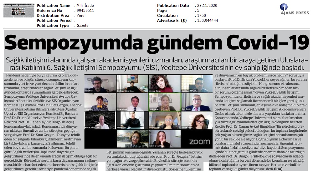 Yeditepe Üniversitesi ve Anadolu Üniversitesi işbirliğiyle, Yeditepe Üniversitesi’nin ev sahipliğinde, 26 – 27 Kasım tarihlerinde, bu yıl pandemi koşulları nedeniyle çevrim içi platformda gerçekleştirilen 6. Sağlık İletişimi Sempozyumu (SİS), yurtiçi ve yurtdışından sağlık iletişimi alanında çalışan çok sayıda uzmanı bir araya getirdi.