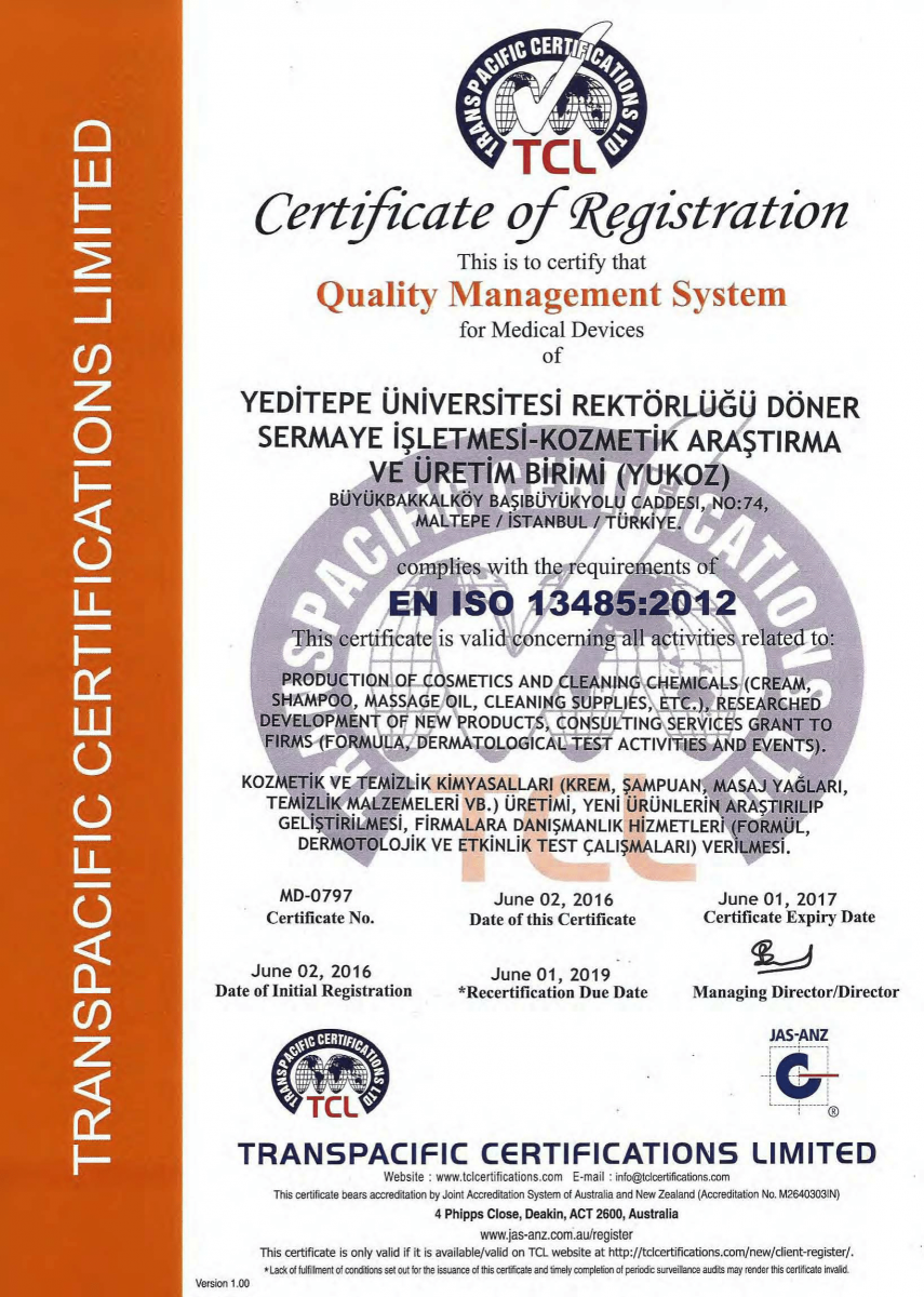 Yeditepe Üniversitesi Kozmetik Araştırma ve Üretim Birimi (YUKOZ), daha önce sahip olduğu ISO 9001 Kalite Yönetim Sistemi, ISO 14000 Çevre Yönetim Sistemi, OHSAS 18000 İşçi Sağlığı ve İş güvenliği Yönetim Sistemi ve ISO 22716 GMP (İyi Üretim Uygulamaları) Kozmetik Yönetim Sistemin sertifikalarından sonra, tüm dünyada geçerli olan ISO 13485: Tıbbi Cihazlar için Kalite Yönetim Sistemi belgesini almaya hak kazandı.