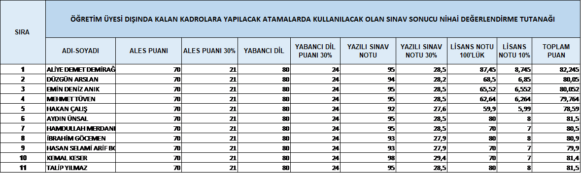 17.05.2019 tarihinde Resmi Gazetede yayınlanan Üniversitemiz Meslek Yüksekokulu Bölümlerinde ilan edilen Öğretim Görevlisi kadrosu için yapılan sınav sonucunda nihai değerlendirme sonuçlarına göre aşağıda isimleri yazılı kişi/kişiler açık bulunan Öğretim Görevlisi kadrosuna atanmaya hak kazanmışlardır.