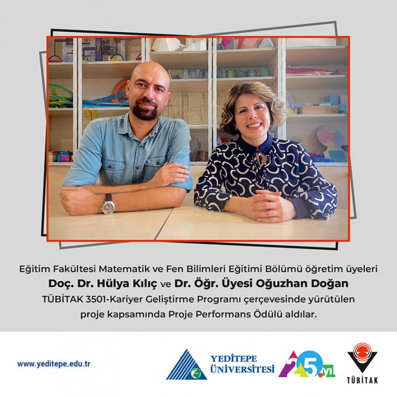 Eğitim Fakültesi Matematik ve Fen Bilimleri Eğitimi Bölümü öğretim üyeleri Doç. Dr. Hülya Kılıç ve Dr. Öğr. Üyesi Oğuzhan Doğan TÜBİTAK 3501 - Kariyer Geliştirme Programı çerçevesinde yürütülen proje kapsamında Proje Performans Ödülü aldılar.