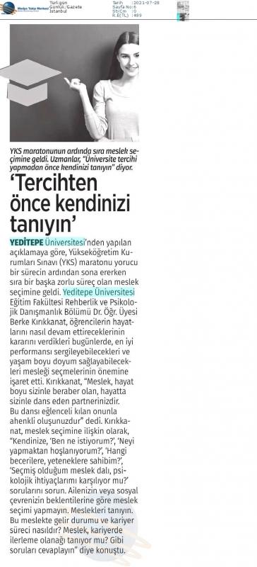 Yeditepe Üniversitesi Eğitim Fakültesi Rehberlik ve Psikolojik Danışmanlık Bölümü Dr. Öğr. Üyesi Berke Kırıkkanat, hayatınızı nasıl devam ettireceğinizin kararını verdiğiniz bugünlerde en iyi performansı sergileyebileceğiniz ve yaşam boyu doyum sağlayabileceğiniz mesleği seçmenizin önemine işaret etti. “Meslek, hayat boyu sizinle beraber olan, hayatta sizinle dans eden partnerinizdir. Bu dansı eğlenceli kılan onunla ahenkli oluşunuzdur” diyen Kırıkkanat, meslek seçimi sırasında izlenmesi gereken aşamaları anlattı.