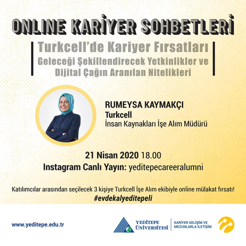 Turkcell İnsan Kaynakları İşe Alım Müdürü Rümeysa Kaymakçı ile 21 Nisan 2020 Salı günü gerçekleştireceğimiz, Turkcell’de Kariyer Fırsatlarını ve geleceği şekillendirecek yetkinlikleri, dijital çağın aranılan niteliklerini konuşacağımız Yeditepelilere özel online kariyer sohbetine seni de bekliyoruz.